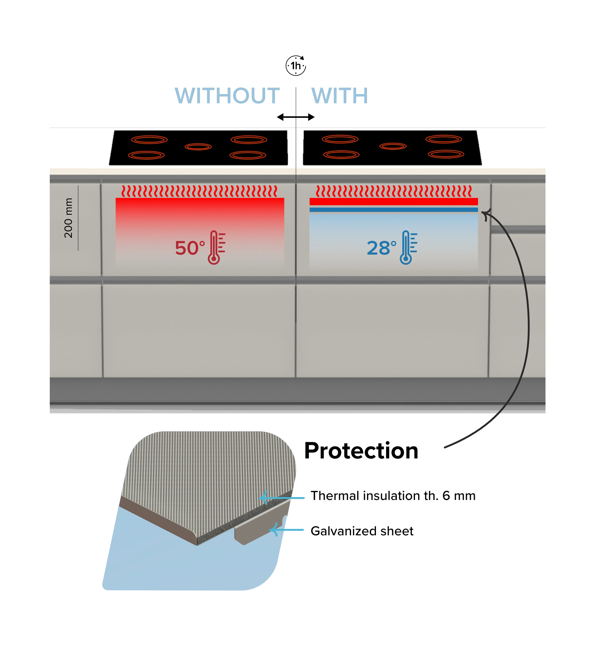 Grazie a un materiale tecnico multistrato altamente resistente, il nuovo pannello garantisce una barriera termica efficace, mantenendo la temperatura interna dei mobili significativamente più bassa rispetto ai sistemi tradizionali.