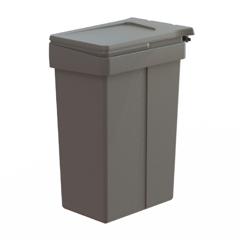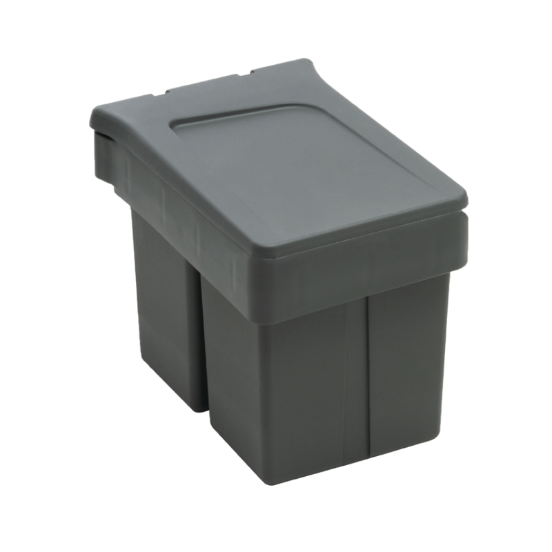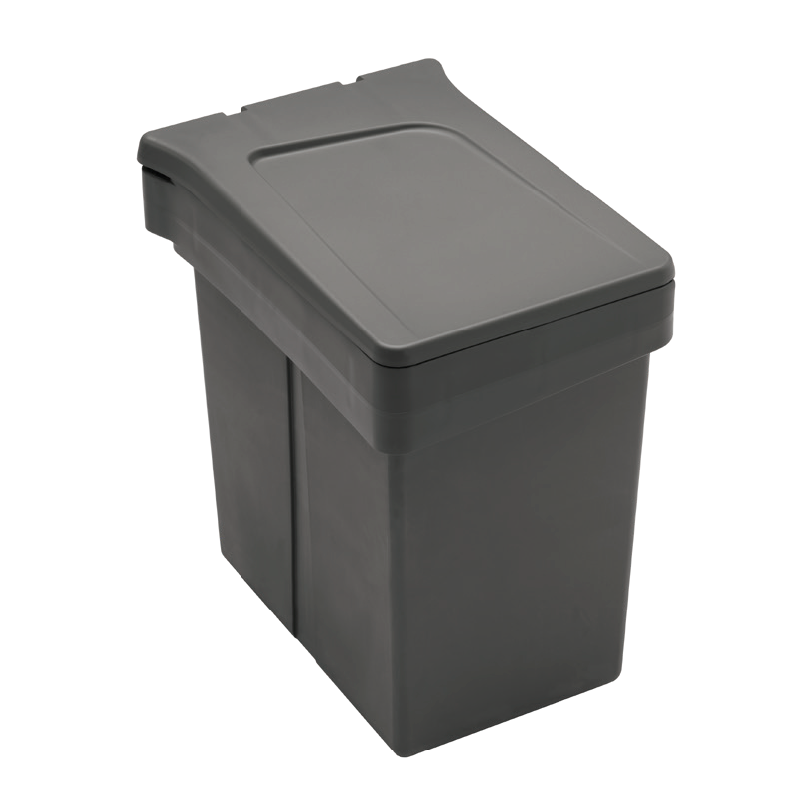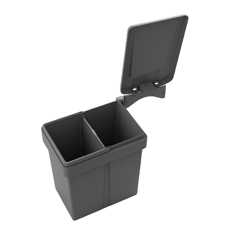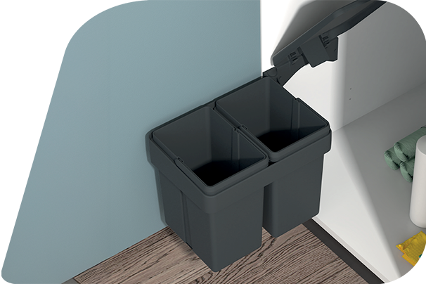 La pattumiera ad anta ha un sistema di fissaggio a telaio che, fissato all’anta del mobile permette l’apertura e chiusura automatica del coperchio contestuale all’apertura e alla chiusura dell’anta. Disponibile con configurazione di secchi da 7 a 25 L.
